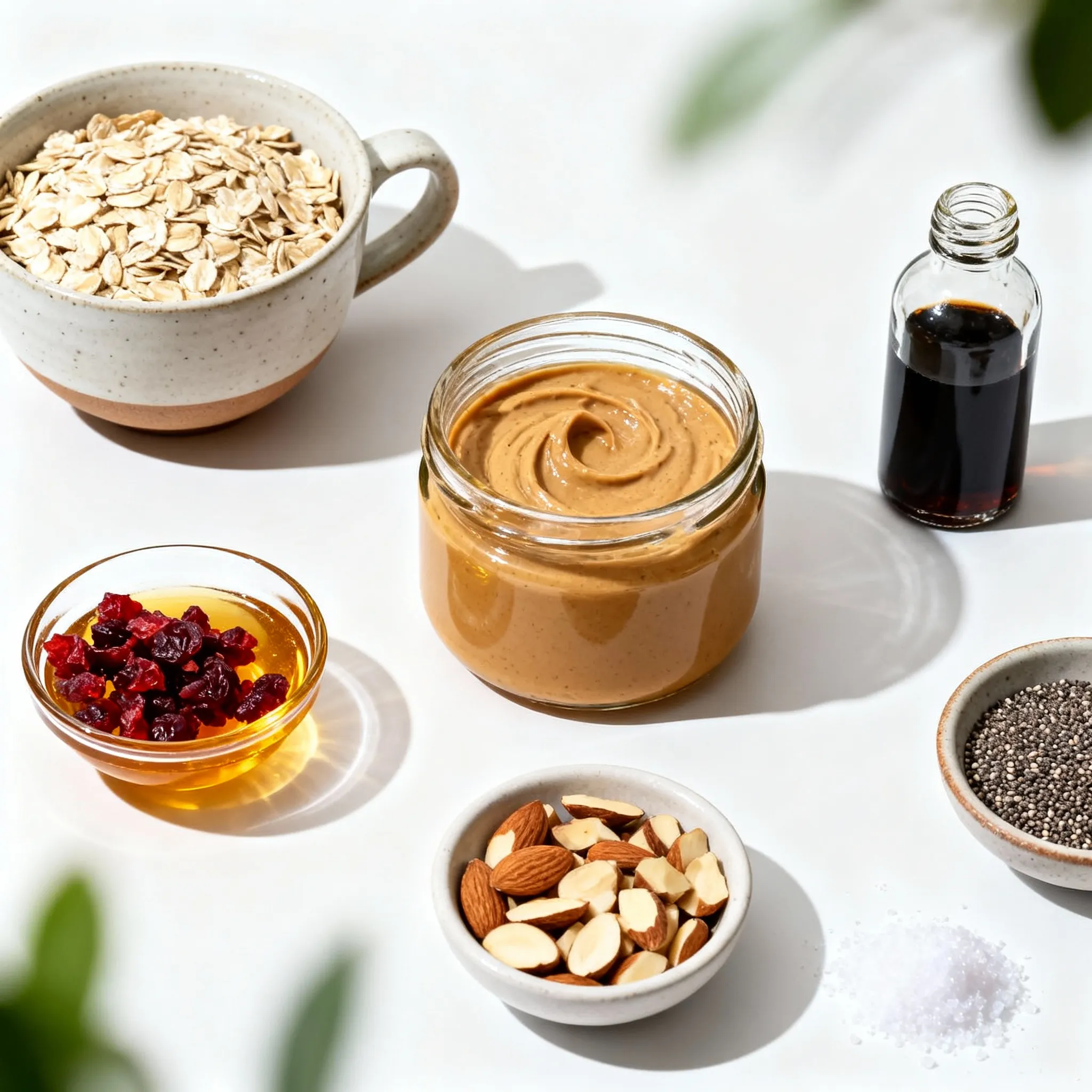 1. Start by gathering all your ingredients. You will need rolled oats, almond butter, honey or maple syrup, chopped dried cranberries, chopped almonds, chia seeds, vanilla extract, and a pinch of salt.