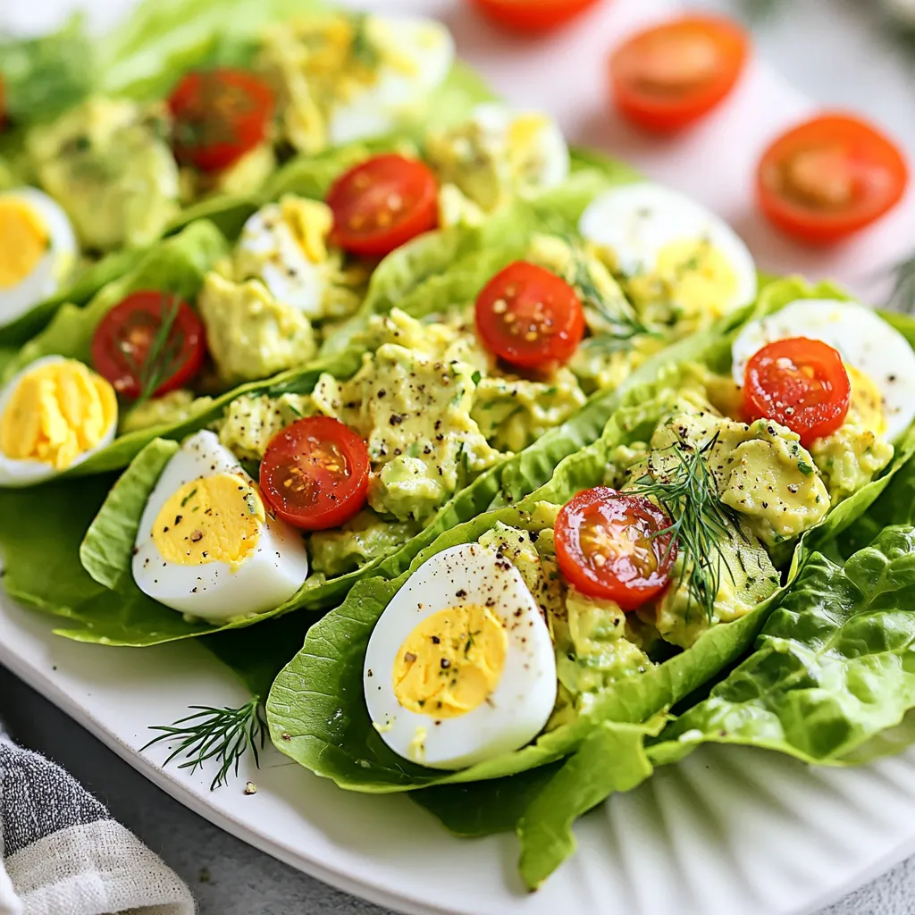 - 4 large hard-boiled eggs - 1 ripe avocado - 2 tablespoons Greek yogurt - 1 tablespoon Dijon mustard - 1 tablespoon fresh lemon juice - 1 tablespoon fresh dill, chopped - Salt and pepper to taste - Cherry tomatoes for garnish - 1 head of romaine lettuce, leaves separated Creating avocado egg salad lettuce wraps is simple and fun. The main ingredients are hard-boiled eggs and ripe avocado. These two bring creaminess and protein to the dish. I love using Greek yogurt for a tangy twist. It also adds a nice creaminess without extra fat. Dijon mustard kicks up the flavor too, making each bite exciting. For the seasoning, I always add fresh lemon juice. It brightens the salad and keeps the avocado from browning. Fresh dill adds a lovely herbal note. Salt and pepper balance all the flavors perfectly. Finally, halved cherry tomatoes make a beautiful garnish. They add color and freshness. The lettuce base is important too. I prefer using romaine lettuce. Its sturdy leaves hold the filling well. You can separate the leaves gently to create perfect wraps. This dish is not only tasty, but it is also a healthy meal option. {{ingredient_image_1}} 1. Start by chopping the hard-boiled eggs into small pieces. You want them to be bite-sized. Place the chopped eggs in a mixing bowl. 2. Next, cut the ripe avocado in half. Remove the pit carefully. Use a spoon to scoop out the green flesh and add it to the bowl with the eggs. 1. Now, add the Greek yogurt, Dijon mustard, lemon juice, and chopped dill to the bowl. These ingredients add flavor and creaminess. 2. With a fork, gently mash the avocado with the eggs. Mix until everything combines but remains chunky. This gives a nice texture. Season the mixture with salt and pepper to taste. Adjust the flavors to your liking. 1. Take a lettuce leaf and spoon a generous amount of the avocado egg salad mixture into the center. This will be your filling. 2. Fold the sides of the lettuce leaf over the filling. This creates a wrap. If needed, secure it with a toothpick. 3. Repeat the process with the remaining lettuce leaves and egg salad filling. 4. Serve them right away. You can garnish with halved cherry tomatoes for a fresh touch. Enjoy your healthy meal! To get the right texture, mash the avocado gently. You want it creamy, but still chunky. If you over-mash, it turns too smooth. Start with the fork and mix in the eggs carefully. For flavor adjustment, taste as you go. Add salt and pepper slowly. This way, you find the perfect balance. When arranging the wraps, use a nice platter. Lay them out neatly for a clean look. Drizzle some extra lemon juice over the wraps for brightness. This also adds flavor. A few sprigs of fresh dill on top makes it pop. You want your dish to look as good as it tastes. If you want a vegan option, swap Greek yogurt for a plant-based alternative. Many brands offer tasty vegan yogurts. For those watching carbs, use smaller lettuce leaves. Romaine is great, but butter lettuce also works. It’s low-carb and gluten-free, making it a perfect choice for everyone. Pro Tips Use Fresh Ingredients: Always opt for the freshest avocados and herbs to enhance the flavor and texture of your avocado egg salad. Perfect Egg Cooking: Ensure your eggs are perfectly hard-boiled by placing them in cold water, bringing it to a boil, then covering and letting them sit off heat for 12 minutes. Customize Your Wrap: Feel free to add other ingredients like diced bell peppers or green onions for extra crunch and flavor. Storage Tips: If you have leftovers, store the avocado egg salad in an airtight container in the fridge for up to 2 days, but consume the lettuce wraps fresh. {{image_2}} You can change up your avocado egg salad easily. Adding veggies makes it fresh and colorful. Try diced bell peppers for crunch. You can also use cucumbers for a cool taste. Want more protein? Shredded chicken works well in this dish. You can even mix in tuna for a different flavor. These add-ins boost nutrition and keep things interesting. Switching up your dressings can change the whole dish. Use avocado oil or olive oil for a rich taste. Both oils add healthy fats while keeping it light. You can also try different mustards. Whole grain mustard gives a nice kick that pairs well with the creamy avocado. Experiment with these options to find your perfect mix. Spices and herbs can take your wraps to the next level. Adding paprika gives a smoky flavor. Garlic powder can add depth and warmth. Fresh herbs like cilantro or parsley can brighten up your salad. Mix in what you love to make it truly yours. These flavor boosters make every bite exciting. To keep your avocado egg salad fresh, store it in an airtight container. This helps prevent air from spoiling the salad. Place it in the refrigerator right after serving. It stays good for about 2 to 3 days. Always check for changes in smell or color before eating. You usually won’t need to reheat this salad. If you want to warm it, do so gently. Use a microwave on low power for about 15 seconds. But remember, reheating may change the texture. Another option is to use the salad in other dishes. Try it on toast or in a wrap for a tasty twist. Can you freeze avocado egg salad? I do not recommend it. Freezing will change the texture of the avocado and eggs. If you must freeze it, use a freezer-safe container. Thaw it overnight in the fridge before using. However, be ready for a different texture once it’s thawed. If you don't have Greek yogurt, you can use these options: - Sour cream - Plain yogurt - Silken tofu (for a vegan option) - Cottage cheese These substitutes will give you a creamy texture. Each option adds a different flavor. Sour cream is tangy, while silken tofu is mild. To boil eggs perfectly, follow these steps: 1. Place your eggs in a pot. 2. Cover with cold water, about an inch above the eggs. 3. Bring the water to a boil over medium heat. 4. Once boiling, cover the pot and remove it from heat. 5. Let the eggs sit for 9-12 minu