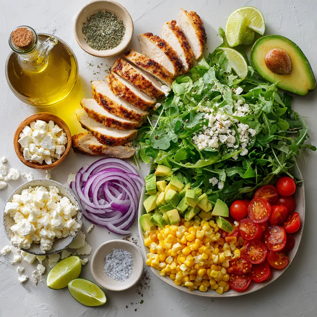 Now for the salad parts! I like a mix of greens, like romaine and spinach. Six cups give a good base. I add a cup of halved cherry tomatoes for sweetness. A half red onion, thinly sliced, gives a nice crunch. I toss in a diced avocado for creaminess. Corn adds a sweet pop, and the feta cheese brings a salty touch.