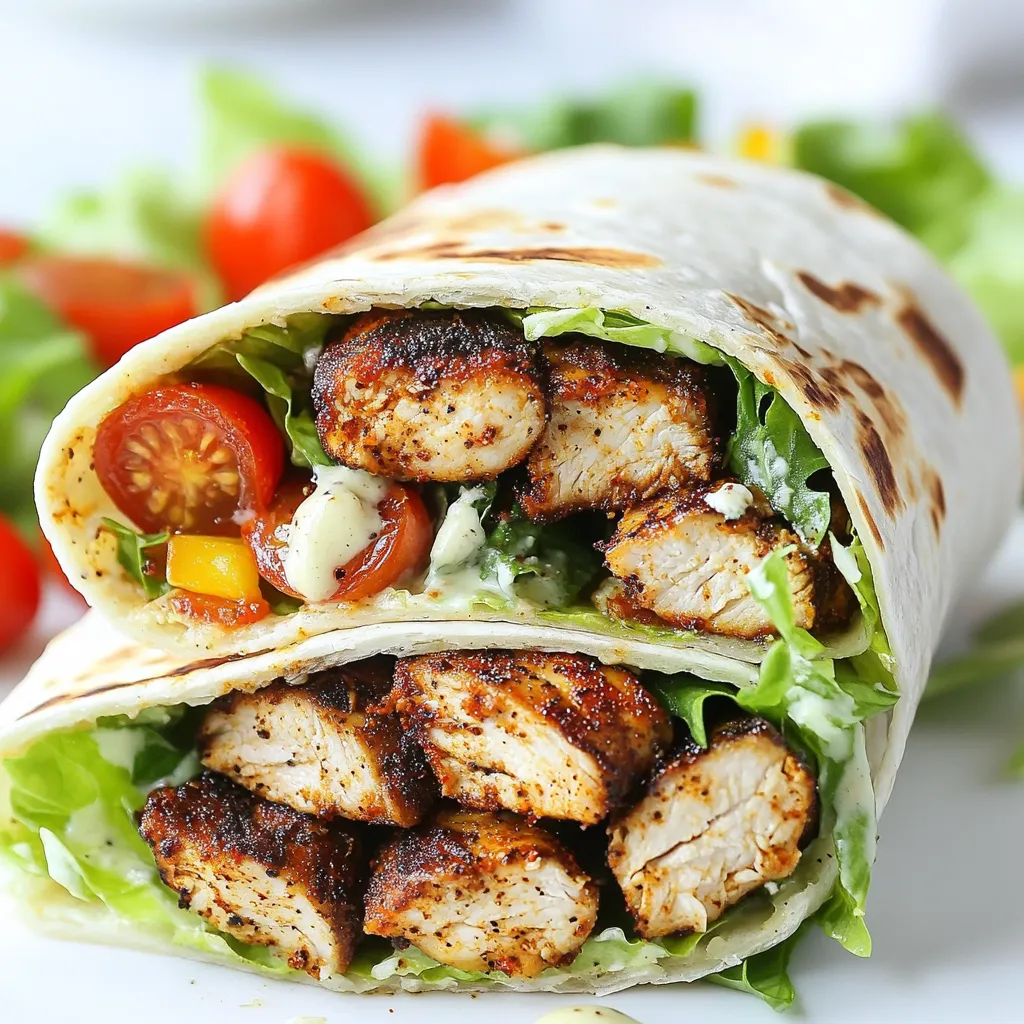 - 2 boneless, skinless chicken breasts - 2 tablespoons Cajun seasoning - 1 tablespoon olive oil - 4 large tortillas - 2 cups romaine lettuce, chopped - ½ cup cherry tomatoes, halved - ½ cup Parmesan cheese, grated - ½ cup Caesar dressing (store-bought or homemade) - Salt and pepper to taste The heart of this Blackened Chicken Caesar Wrap lies in its fresh and bold ingredients. The chicken adds protein, while the romaine brings crunch. Cherry tomatoes give a pop of color and sweetness. The Parmesan cheese melts into the wrap, adding a rich, creamy flavor. Lastly, the Cajun seasoning gives the chicken its signature kick. - Fresh basil leaves Adding fresh basil leaves not only looks great but also adds a nice herbal note. It balances the spicy flavors from the Cajun seasoning. You can sprinkle them on top for a touch of color and taste. - Chicken can be swapped for shrimp or tofu for different flavors. - Use spinach or mixed greens instead of romaine for variety. - Try feta cheese instead of Parmesan for a tangy twist. - If you can't find Cajun seasoning, a mix of paprika, garlic powder, and cayenne can work well. These substitutions allow for creativity. You can adjust the wrap to your taste or dietary needs. Don't hesitate to mix things up! {{ingredient_image_1}} Start by rubbing the chicken breasts with olive oil. Use about 1 tablespoon for both breasts. Next, sprinkle the Cajun seasoning evenly over the chicken. Make sure every part is well coated. This adds great flavor. You can also add salt and pepper to taste if you like. Heat your skillet on medium-high heat. Once it is hot, place the seasoned chicken breasts in the pan. Cook each side for 6 to 7 minutes. You want the internal temperature to reach 165°F. This ensures the chicken is safe to eat. After cooking, take the chicken out and let it rest for a few minutes. This helps keep it juicy. Take a tortilla and lay it flat on a clean surface. Add a layer of chopped romaine lettuce in the center. Next, place the sliced blackened chicken on top. Add halved cherry tomatoes and sprinkle grated Parmesan cheese over everything. Finally, drizzle Caesar dressing on top. Now, fold the sides of the tortilla inwards. Roll it tightly from the bottom up. Your wrap is now ready! Slice it in half for a great presentation. Optionally, you can add fresh basil leaves on top for a pop of color and flavor. When making a Blackened Chicken Caesar Wrap, seasoning is key. Use Cajun seasoning generously. This adds a bold flavor to the chicken. Make sure to rub the seasoning all over the chicken. You want every bite to burst with taste. If you like more heat, add a pinch of cayenne. For a milder flavor, use less seasoning. Cooking the chicken well makes a big difference. Heat your skillet over medium-high heat before adding the chicken. This helps create that nice blackened crust. Cook each side for about 6-7 minutes. Check the internal temperature; it should reach 165°F. Let the chicken rest after cooking. This keeps it juicy and tender. You can prepare this wrap in advance. Cook the chicken and slice it up. Store it in the fridge in an airtight container. You can also chop the lettuce and tomatoes ahead of time. When you're ready to eat, just assemble the wrap. This makes for a quick and easy lunch or dinner option. Pro Tips Seasoning Matters: Don’t skimp on the Cajun seasoning; it’s what gives the chicken its bold flavor. Make sure to cover all sides of the chicken breasts evenly. Rest the Chicken: Allowing the chicken to rest after cooking helps retain its juices, making it more tender and juicy when sliced. Fresh Ingredients: Use fresh romaine lettuce and cherry tomatoes for the best flavor and texture. They add freshness that balances the richness of the chicken and dressing. Wrap It Right: To prevent your wrap from falling apart, make sure to fold the sides inward snugly before rolling from the bottom up. {{image_2}} You can switch the chicken for shrimp or tofu. Shrimp cooks fast and adds a nice taste. Just season it like you would the chicken. Cook shrimp for about 3-4 minutes on each side. For tofu, use firm tofu and press it to remove water. Slice it and season well. Cook until it’s golden brown. Both options keep the wrap yummy and fun. While Caesar dressing is classic, many choices exist. Try ranch for a creamy twist. You can also use a zesty vinaigrette for a lighter option. If you want a kick, add buffalo sauce or a spicy yogurt dressing. Each dressing adds its own flavor, making the wrap unique. Boost the wrap's nutrition by adding more veggies. Spinach adds iron and flavor. Bell peppers add crunch and bright colors. You can also throw in cucumbers for a refreshing bite. Carrots add sweetness and crunch too. Mixing in different veggies makes the wrap healthier and more appealing. To keep your Blackened Chicken Caesar Wrap fresh, wrap it tightly in plastic wrap. You can also use aluminum foil. Place it in an airtight container. Store it in the fridge. This keeps the flavors and textures intact. Make sure it is completely cooled before storing. This prevents moisture buildup. When you're ready to eat, you can reheat the wrap. Unwrap it and place it in a skillet over low heat. Heat it for about 5 minutes, turning often. This ensures even warming without making it soggy. You can also microwave it. Place it on a microwave-safe plate, cover it with a damp paper towel, and heat for 30 seconds. Check to see if it's warm enough, then enjoy. The Blackened Chicken Caesar Wrap lasts for up to three days in the fridge. After that, the quality may drop. If you want to keep it longer, you can freeze it. Wrap it tightly in plastic wrap, then place it in a freezer bag. It can last for up to three months in the freezer. Just remember to thaw it in the fridge overnight before reheating. The Blackened Chicken Caesar Wrap comes from classic Cajun cooking. Cajun chefs often blacken fish or chicken. They use high heat and spices to create a crust. This wr
