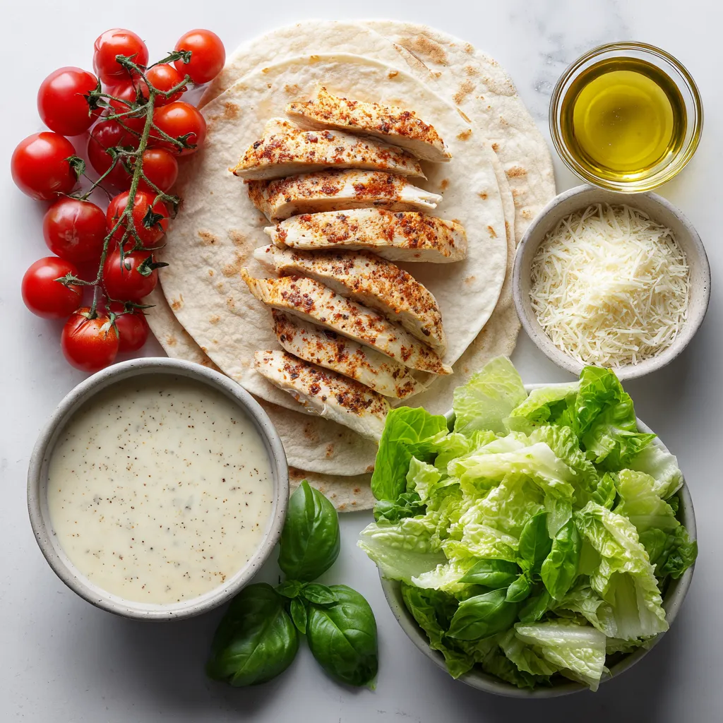 • Lay a tortilla flat and layer chopped romaine lettuce in the center. Top with sliced blackened chicken, cherry tomatoes, and grated Parmesan cheese. Drizzle Caesar dressing over the top.