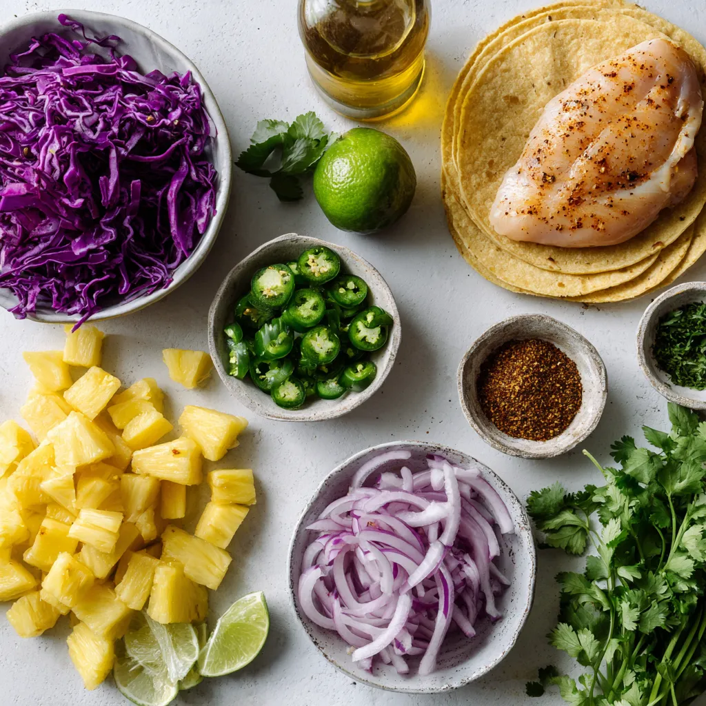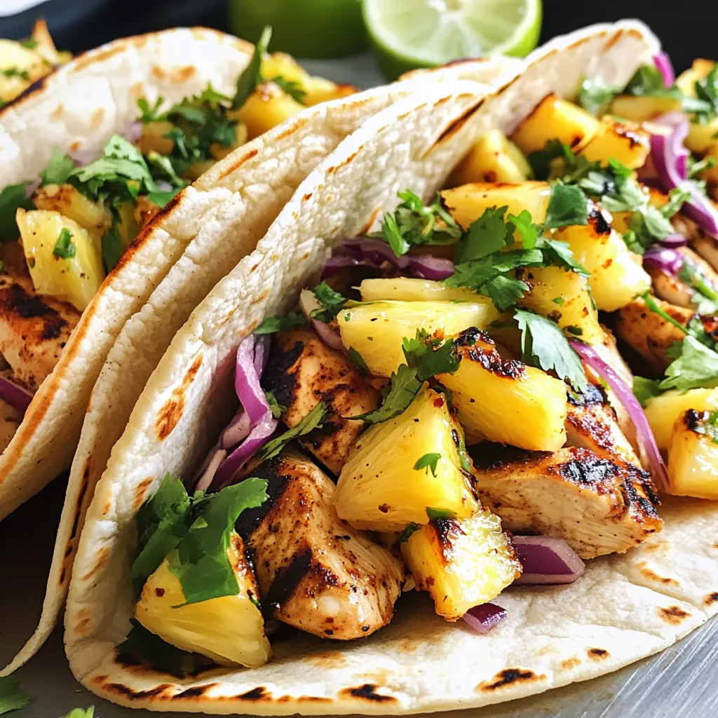Chicken and Marinade Ingredients - 2 large chicken breasts - 2 tablespoons jerk seasoning (store-bought or homemade) - 1 tablespoon olive oil - Salt to taste Slaw Ingredients - 1/2 cup pineapple, diced - 1/2 cup red cabbage, shredded - 1/4 cup red onion, thinly sliced - 1/4 cup fresh cilantro, chopped - Juice of 1 lime Tortilla Options - 8 small corn or flour tortillas - Optional: Sliced jalapeños for extra heat In this recipe, I use chicken breasts for a lean protein. The jerk seasoning gives it a bold flavor. You can use store-bought jerk seasoning or make your own. I often recommend marinating the chicken for at least 30 minutes. This allows the flavors to soak in. The slaw is fresh and bright. It combines sweet pineapple with crunchy cabbage and onion. The lime juice adds a zesty kick that pairs well with the chicken. For the tortillas, you can choose between corn or flour. Both work well and add to the taco's texture. If you love heat, sliced jalapeños can add a nice touch. They provide an extra punch if you want it spicier. With these ingredients, you create a vibrant dish that bursts with flavor. It's a fun and easy meal for any gathering or a quick weeknight dinner. {{ingredient_image_1}} Start by taking two large chicken breasts. In a bowl, coat the chicken with two tablespoons of jerk seasoning. Add one tablespoon of olive oil for moisture. Use your hands to massage the spices into the chicken. This helps the flavors soak in. Let it marinate for at least 30 minutes. If you have time, marinate it for up to four hours in the fridge. This extra time makes the chicken taste even better. Next, preheat your grill or a stovetop grill pan. Set it to medium-high heat. Once hot, place the marinated chicken on the grill. Cook it for about six to seven minutes on each side. You want the chicken to be fully cooked. The juices should run clear when you cut into it. After cooking, let the chicken rest for a few minutes. Then, slice it into thin strips for the tacos. Now, take a separate bowl to make the slaw. Start with half a cup of diced pineapple. Add half a cup of shredded red cabbage and a quarter cup of thinly sliced red onion. Toss in a quarter cup of chopped cilantro for freshness. Squeeze the juice of one lime over the mixture. Sprinkle a pinch of salt to taste. Mix everything well until it combines nicely. This slaw will add crunch and sweetness to your tacos. For the tortillas, you can use either corn or flour. Heat a skillet or grill over medium heat. Warm each tortilla for about 30 seconds on each side. You want them to be soft and pliable. This step makes them easier to fold and eat. Do not let them get too crispy; you want them to stay flexible. It’s time to build your tacos! Take a warm tortilla and lay it flat. Add a few strips of the jerk chicken in the center. Next, pile on a generous amount of your pineapple slaw. If you like it spicy, feel free to add sliced jalapeños on top. The mix of flavors will make your taste buds dance! Serve your tacos right away for the best taste. Garnish with extra cilantro or a wedge of lime on the side. This adds a nice touch and extra flavor. Enjoy them fresh and watch your friends and family smile with each bite! Select jerk seasoning that fits your taste. You can use store-bought or homemade. Store-bought is easy and saves time. Homemade allows you to adjust flavors to your liking. Look for a mix with spices like allspice, thyme, and pepper. For a bolder flavor, try adding garlic or ginger. Cook chicken breasts on medium-high heat. This gives a nice sear and keeps it juicy. Grill for about 6-7 minutes on each side. Check that the juices run clear before serving. Let the chicken rest for a few minutes after cooking. This helps keep the moisture inside. Slice it into thin strips for the tacos. For tasty pineapple slaw, mix diced pineapple with red cabbage, red onion, and cilantro. The sweet pineapple balances the spicy jerk chicken well. Squeeze fresh lime juice over the slaw for zest. Add a pinch of salt to enhance the flavors. Toss well to combine everything. You can choose corn or flour tortillas based on preference. Corn tortillas have a nice corn flavor and texture. Flour tortillas are soft and easy to wrap. Either way, warm them briefly before adding fillings. This makes them pliable and enhances taste. Enjoy tacos right away for the best experience. Pro Tips Marination Time: For the best flavor, marinate the chicken for at least 1 hour, or overnight if possible, to allow the jerk seasoning to penetrate deeply. Grilling Technique: Ensure your grill is properly preheated before adding the chicken to achieve a nice sear and prevent sticking. Fresh Ingredients: Use fresh cilantro and lime juice for the slaw to elevate the flavors and add brightness to your tacos. Personalize Your Heat: If you enjoy spicy food, include sliced jalapeños or a drizzle of hot sauce on top of your tacos for an extra kick. {{image_2}} You can swap chicken for fish or tofu for a new twist. Fish like mahi-mahi or tilapia cooks fast and holds flavor well. Tofu absorbs the jerk spices nicely if you press it first. Both options make these tacos lighter yet still tasty. Feel free to change up the slaw for your tacos. Instead of pineapple, try mango or papaya for a sweet touch. You can add carrots for crunch or even some diced bell peppers. Experiment with different herbs like mint for a fresh flavor. If you like heat, add sliced jalapeños or a drizzle of hot sauce. You can also try pickled onions for a zesty kick. Chopped fresh peppers or a sprinkle of cayenne can make your dish even bolder. Don’t be afraid to mix and match toppings to find your favorite combo! To store your leftover tacos, place them in an airtight container. Make sure to separate the chicken from the slaw and tortillas. This keeps everything fresh. The chicken can stay in the fridge for up to four days. The slaw lasts about two days. Store tortillas at room temperature, but use them within 