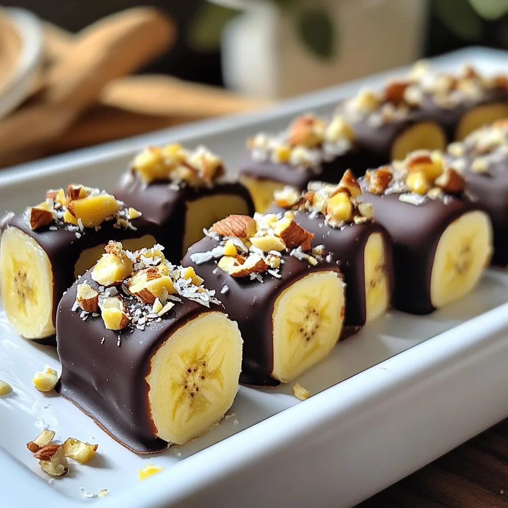 Delicious chocolate-covered banana slices with nuts and coconut.