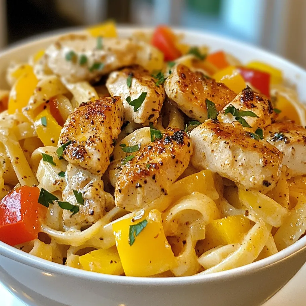 - 8 oz fettuccine or penne pasta - 2 chicken breasts, sliced - 2 tablespoons Cajun seasoning - 2 tablespoons olive oil - 1 cup heavy cream - 1 cup chicken broth - 1 cup bell peppers (mixed colors), sliced - 1 small onion, diced - 3 cloves garlic, minced - 1/2 cup grated Parmesan cheese - Salt and pepper to taste - Fresh parsley, chopped (for garnish) To start, you need the right pasta. I like fettuccine or penne for this dish. Both hold the sauce well. Next, get two chicken breasts and slice them thin. This makes sure they cook fast and soak up flavor. Now, let’s talk about seasoning. You need Cajun seasoning, which adds a nice kick. Use about two tablespoons. Olive oil is next; it helps brown the chicken and adds richness. For the sauce, you will need heavy cream and chicken broth. These make the dish creamy and smooth. You also need bell peppers and an onion. They add color and taste. Lastly, grab some garlic for an extra layer of flavor. Don't forget the Parmesan cheese! It gives the sauce a lovely finish. For garnishing, fresh parsley is a must. It looks great and adds a fresh taste. With these ingredients, you are ready to make a bold and flavorful meal! {{ingredient_image_1}} Start by boiling salted water in a large pot. The salt enhances the flavor of the pasta. Once the water boils, add 8 oz of fettuccine or penne. Cook it according to the package instructions. Aim for an al dente texture, which means the pasta should be firm yet tender. This usually takes about 8-10 minutes. Drain the pasta and set it aside while you prepare the rest. Next, season 2 sliced chicken breasts. Use 2 tablespoons of Cajun seasoning, salt, and pepper to coat the chicken evenly. This step is key for flavor. Let the chicken sit for a few minutes. This helps the seasoning stick and enhance the taste. Heat 2 tablespoons of olive oil in a large skillet over medium-high heat. Once hot, add the seasoned chicken slices. Sauté the chicken for about 5-7 minutes until it turns golden brown and is cooked through. Remove the chicken from the skillet and set it aside. In the same skillet, add 1 diced onion and 1 cup of mixed sliced bell peppers. Sauté these for about 3-4 minutes until they soften. Then, add 3 cloves of minced garlic and cook for another 1-2 minutes until fragrant. Now, pour in 1 cup of chicken broth. Scrape up any browned bits from the bottom of the skillet. This adds even more flavor to the sauce. Let it simmer for 2-3 minutes. Next, add 1 cup of heavy cream and bring it to a gentle boil. Stir in the cooked pasta and the sautéed chicken. Then, add 1/2 cup of grated Parmesan cheese. Mix everything until the pasta is well coated in the creamy sauce. Taste it and adjust the seasoning with salt and pepper as you see fit. When ready to serve, plate the dish nicely. Garnish it with fresh chopped parsley for a pop of color. This meal pairs well with a simple green salad or garlic bread for a complete experience. Enjoy your bold and flavorful Creamy Cajun Chicken Pasta! - Storing leftover sauce: If you have extra sauce, let it cool first. Pour it into a container and seal it tightly. It will stay fresh in the fridge for three days. You can also freeze it for up to a month. To reheat, warm it gently on the stove. - Preventing noodles from sticking: To keep your pasta from sticking, add a splash of olive oil when you drain it. Toss it lightly to coat. This simple step makes a big difference. - Alternative cooking methods: You can make this dish in a slow cooker. Cook the chicken with the Cajun seasoning first. Then, add the broth and cream later. Let everything simmer for about four hours. This brings out rich flavors. - Cooking tips for seasoning and flavor enhancement: Always taste as you go! If you want more spice, add a pinch of cayenne pepper. For a touch of sweetness, toss in some diced tomatoes. Both options will give your dish extra depth. - Recommended wine pairings: This dish pairs well with a chilled Chardonnay. The crispness of the wine balances the creaminess of the sauce. If you prefer red wine, try a light Pinot Noir. - Garnishing ideas for added visual appeal: A sprinkle of fresh parsley adds color and freshness. You can also use a few slices of bell pepper on top. This makes your dish look as good as it tastes! Pro Tips Use Fresh Ingredients: For the best flavor, opt for fresh bell peppers and garlic. Fresh ingredients enhance the taste and aroma of your dish. Adjust the Spice Level: If you prefer a milder dish, reduce the amount of Cajun seasoning or choose a milder blend. You can always add more spice later! Reserve Pasta Water: Save a cup of pasta water before draining. It can be added to the sauce to adjust consistency and help the sauce adhere to the pasta. Garnish for Freshness: A sprinkle of fresh parsley not only adds color but also a fresh flavor that complements the creamy sauce perfectly. {{image_2}} You can easily change the protein in this dish. Instead of chicken, try shrimp or sausage. Shrimp cooks fast and adds a nice touch. Sausage brings a spicy kick that pairs well with Cajun flavors. You can also swap out the veggies. Try adding zucchini, spinach, or mushrooms. These can bring new colors and tastes to your pasta. Mix and match based on what you have at home. If you need gluten-free options, use gluten-free pasta. Many brands offer great choices that cook well. Check the package for cooking times. For dairy-free options, look for cream substitutes like coconut milk or cashew cream. Nutritional yeast can replace the Parmesan cheese for a cheesy flavor without dairy. Adjust the spice levels to fit your taste. If you like it spicy, add more Cajun seasoning. You can also sprinkle in some cayenne pepper for an extra kick. Adding fresh herbs like basil or thyme can enhance the flavor. Mix in chopped parsley or chives for fresh notes. These small changes can make your dish unique and exciting. To store your leftover creamy Cajun chicken pasta, allow it to cool first. Place t