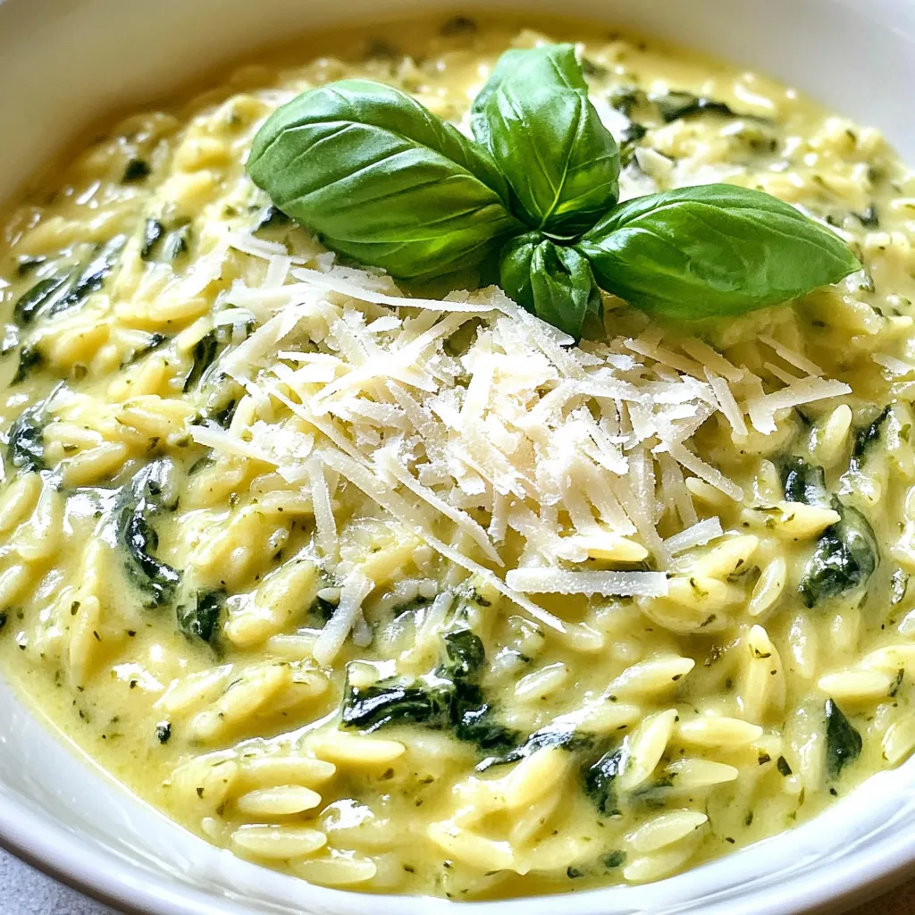 A delicious and creamy orzo dish with fresh spinach and Parmesan cheese.