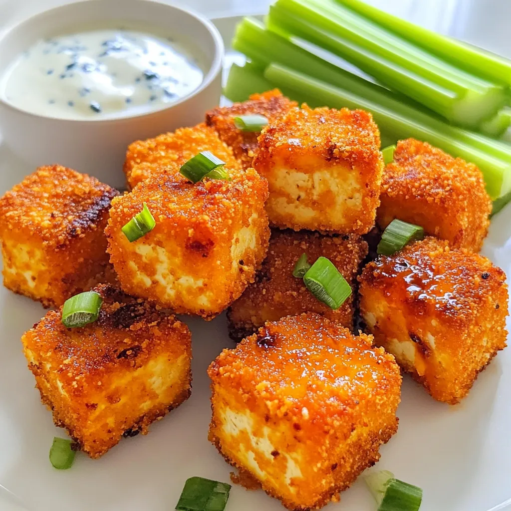 Delicious and crispy tofu bites tossed in a spicy buffalo sauce, perfect as an appetizer or snack.