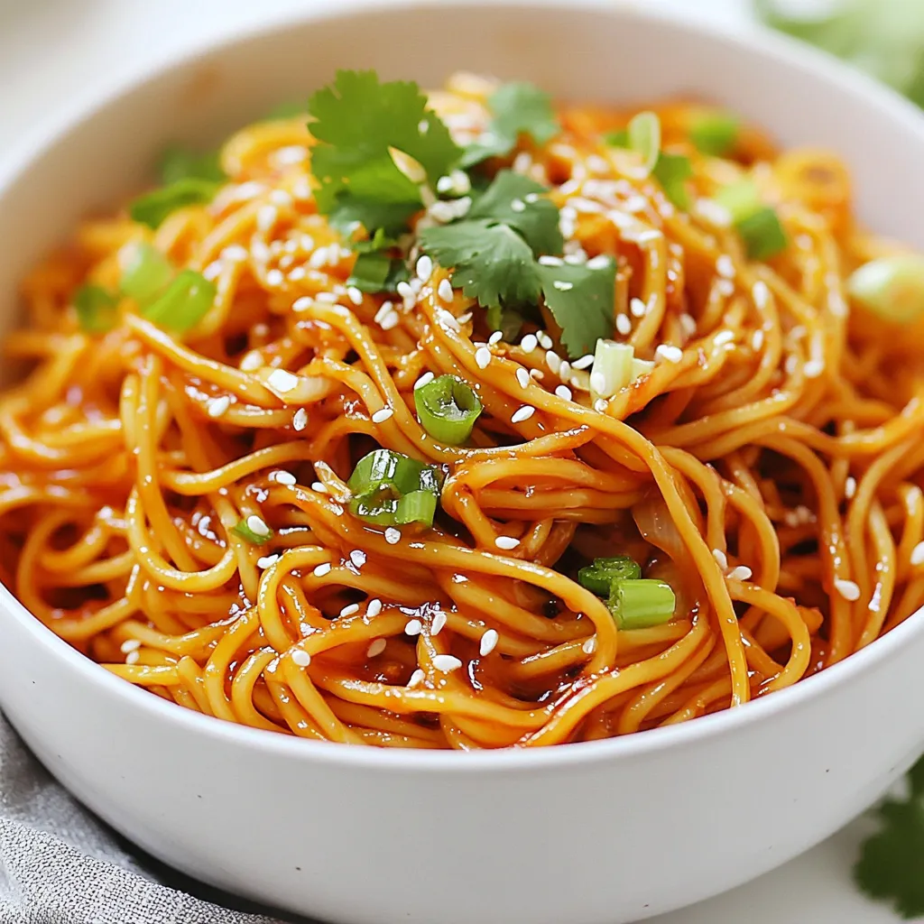 Add the cooked noodles to your skillet. Toss them gently with the sauce. If the noodles feel too sticky, splash in a bit of water or broth. This will loosen them up. After that, sprinkle in 1/2 teaspoon of crushed red pepper flakes for some heat. Toss again to make sure the spice spreads evenly. Finally, remove the skillet from heat. Stir in the sliced green onions and chopped cilantro. Serve your noodles right away, and don’t forget to add sesame seeds on top for some crunch!
