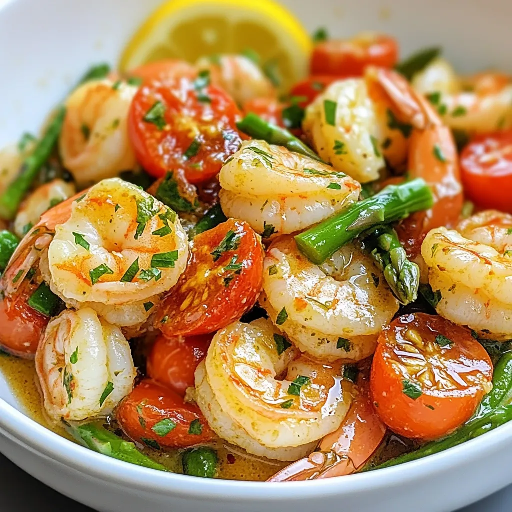 Next, stir in 1/2 cup of halved cherry tomatoes. If you like, you can also add 1/2 cup of trimmed and cut asparagus. Cook the veggies for 2 to 3 minutes until they soften a bit. After that, return the cooked shrimp to the skillet. Pour in the juice and zest of 1 lemon. Toss everything well and heat through for another minute. If you used pasta, add it now and mix in the reserved pasta water to keep it moist.