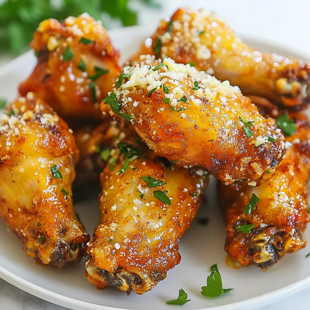 Deliciously crispy chicken wings seasoned with garlic, onion, and Parmesan cheese, cooked to perfection in an air fryer.