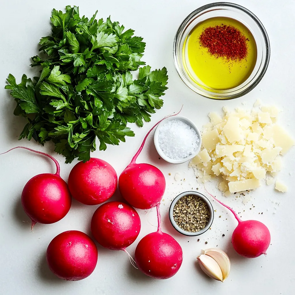 First, gather your ingredients. You’ll need 1 pound of radishes, 3 tablespoons of olive oil, and 4 cloves of minced garlic. You will also need 1/2 teaspoon of salt, 1/4 teaspoon of black pepper, and 1/4 teaspoon of smoked paprika. Lastly, grab 1/2 cup of grated Parmesan cheese and some fresh parsley for garnish.