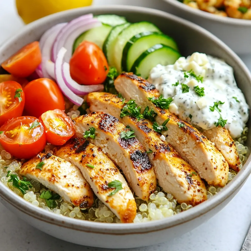 A delicious and healthy bowl featuring marinated chicken, quinoa, and fresh vegetables, topped with tzatziki sauce.