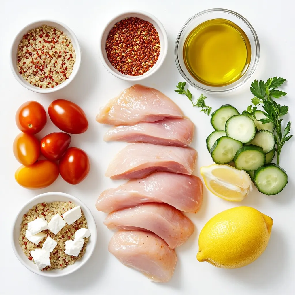In serving bowls, start with a base of quinoa, add the cooked chicken strips, and top with the diced cucumber, halved cherry tomatoes, sliced red onion, crumbled feta, and chopped parsley.