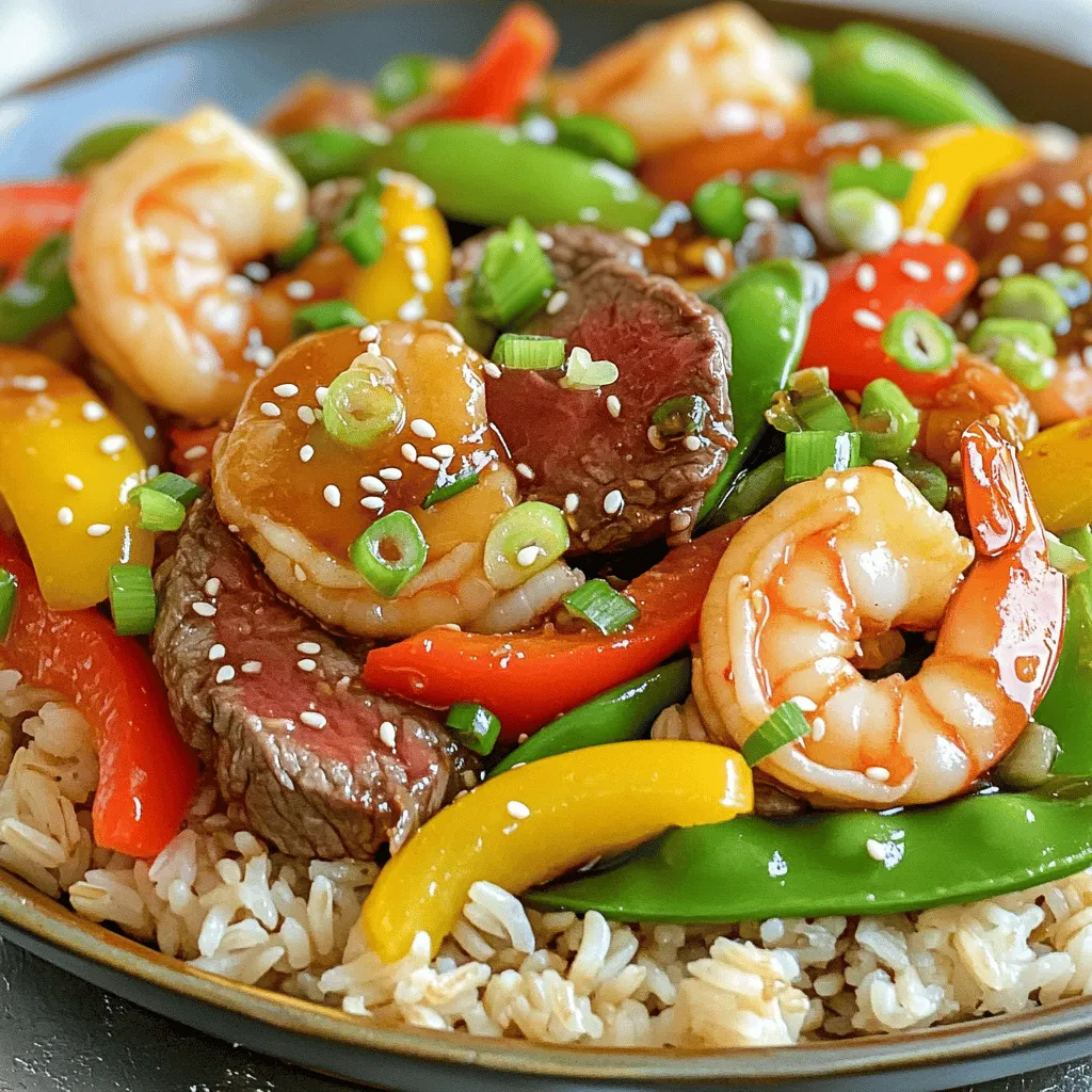 - 8 oz sirloin steak, thinly sliced - 8 oz shrimp, peeled and deveined - 2 cups mixed bell peppers (red, yellow, green) - 1 medium onion, sliced - 3 cloves garlic, minced - 3 tablespoons soy sauce (or tamari for gluten-free) - 1 tablespoon sesame oil - 1 tablespoon vegetable oil - 1 teaspoon red pepper flakes (optional) - Salt and pepper to taste - 1 cup snap peas, trimmed - 2 green onions, chopped - Cooked brown rice or quinoa for serving To make a high-protein steak and shrimp stir-fry, gather these fresh, vibrant ingredients. They bring color and flavor to your dish. The protein from the steak and shrimp makes this meal filling. The bell peppers and snap peas add crunch and nutrition. Using soy sauce adds depth to the flavor. Sesame oil gives a nice nutty taste. Don't forget the garlic for that classic stir-fry aroma! You can serve this dish over brown rice or quinoa. They both add healthy fiber and additional protein. For a full recipe, check out the details in the recipe section. - Prep Your Ingredients: Start by slicing the sirloin steak thinly against the grain. This helps make it tender. Next, peel and devein the shrimp. Cut the mixed bell peppers into thin strips and slice the onion into rings. Mince the garlic and ginger finely. This prep work makes cooking easier and faster. - Heat the Pan: In a large skillet or wok, add the vegetable oil. Heat it over medium-high heat until it shimmers. This shows that the pan is hot enough for frying. - Cook the Steak: Add the sliced steak to the hot pan. Season it with salt and pepper. Stir-fry for about 3-4 minutes, until the steak turns brown. Check for your preferred doneness. Once done, move the steak to a plate. - Cook the Shrimp: In the same hot pan, add the shrimp. Stir-fry for 2-3 minutes. Watch for the shrimp to turn a vibrant pink color. This means they are fully cooked. Remove the shrimp and place them on the plate with the steak. - Sauté the Vegetables: Now, add the sliced onion, bell peppers, and snap peas to the pan. Stir frequently for about 4-5 minutes. You want the veggies to be tender but still crisp. This keeps them tasty and colorful. - Add Aromatics: Next, toss in the minced garlic, ginger, and red pepper flakes if you like heat. Sauté for another 1-2 minutes. This step brings out the lovely scents and flavors. - Combine Everything: Return the cooked steak and shrimp to the pan. Drizzle in the soy sauce and sesame oil. Toss everything together for another 2 minutes. This warms up the dish and mixes the flavors well. - Season to Taste: Taste your stir-fry and adjust the seasoning. Add more salt and pepper if needed. Before serving, sprinkle some chopped green onions on top for freshness. - Serve: Serve the stir-fry over a bed of cooked brown rice or quinoa. This not only adds flavor but also boosts the dish's protein and fiber. For presentation, use a large, shallow bowl. Top with extra green onions and sesame seeds for a beautiful finish. Enjoy your High-Protein Steak and Shrimp Stir-Fry Delight! To boost protein in your stir-fry, consider adding: - Tofu: Firm tofu adds protein and absorbs flavors well. - Eggs: Scramble in a few eggs for extra richness. - Quinoa: Use quinoa instead of rice for a protein-rich base. To get a perfect sear on your steak: - Start with a hot pan. This helps seal in juices. - Don't overcrowd the pan. Cook in batches if needed. - Let the steak rest before slicing. This keeps it juicy. For different levels of doneness, use these cooking times: - Rare: 2-3 minutes per side. - Medium: 4-5 minutes per side. - Well-done: 6-7 minutes per side. Use the right stir-frying techniques for great veggies: - Keep the pan hot to avoid soggy vegetables. - Stir frequently but let them sit occasionally for char. - Add hard veggies like carrots first, then softer ones like bell peppers. Spice up your dish with these extras: - Chili paste: Adds heat and depth. - Fish sauce: A little goes a long way for umami. - Cilantro or basil: Fresh herbs brighten flavors. For balanced seasoning, remember these tips: - Taste as you cook. Adjust salt and pepper to your liking. - Use low-sodium soy sauce to control salt levels. - Add a squeeze of lime or lemon juice before serving. This dish is all about balance and creativity. Explore flavors and enjoy your cooking! For more detailed steps, check the Full Recipe. {{image_4}} You can easily switch out the vegetables in this dish. If you want a fresh taste, try using zucchini, broccoli, or carrots. These veggies add color and crunch. For seafood, feel free to swap shrimp for scallops or even crab. They will offer a unique flavor and texture. If you're looking for gluten-free options, use tamari instead of soy sauce. This keeps the dish tasty for those with gluten issues. For a vegetarian twist, replace steak and shrimp with tofu or tempeh. Both options absorb flavors well and pack a protein punch. To add a global flair, consider using different spices or sauces. Adding teriyaki or oyster sauce can change the entire vibe. You can also sprinkle in some cumin or coriander for a Middle Eastern touch. Don't be afraid to experiment; your taste buds will thank you! To keep your high-protein steak and shrimp stir-fry fresh, follow these tips: - Cool Down: Let the stir-fry cool to room temperature before storing. - Use Airtight Containers: Place leftovers in airtight containers to prevent moisture loss. - Fridge Duration: Store in the fridge for up to 3 days. To enjoy your stir-fry again, use these methods: - Stovetop Method: Heat in a skillet over medium heat for even warming. - Microwave Method: Use a microwave-safe dish and heat in short bursts. - Avoid Soggy Veggies: Reheat just until warm to keep veggies crisp. Freezing is great for longer storage. Here’s how: - Portion Control: Divide stir-fry into single servings before freezing. - Use Freezer Bags: Place portions in freezer bags, removing excess air. - Thawing: Thaw in the fridge overnight or use the microwave. - Reheat After T