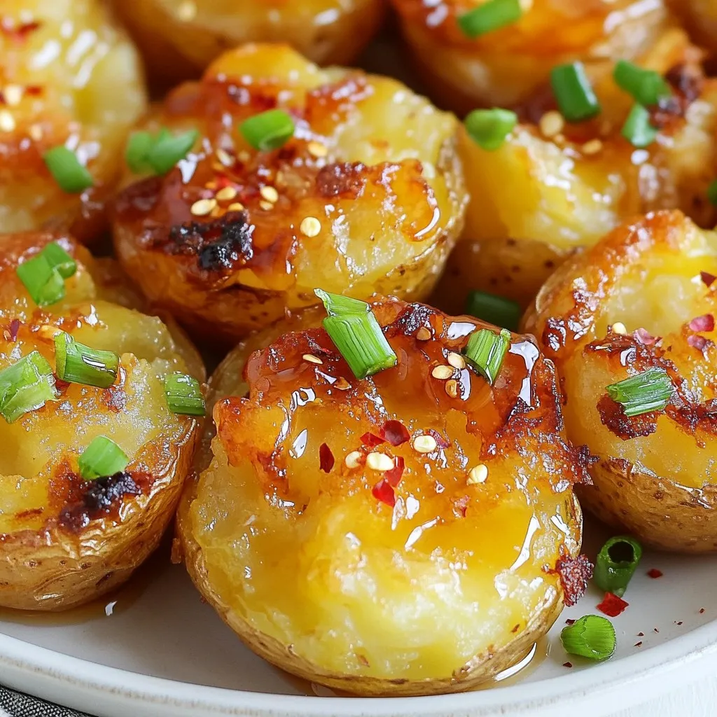 Preheat your oven to 425°F (220°C). Drizzle the smashed potatoes with a little olive oil. Season them with salt and pepper to taste. Bake the potatoes for 20 to 25 minutes. They should turn crispy and golden. After baking, brush the honey garlic sauce over each potato. Return them to the oven and bake for an additional 5 to 10 minutes. This allows the sauce to caramelize, adding great flavor. Enjoy your delicious Honey Garlic Smashed Potatoes!