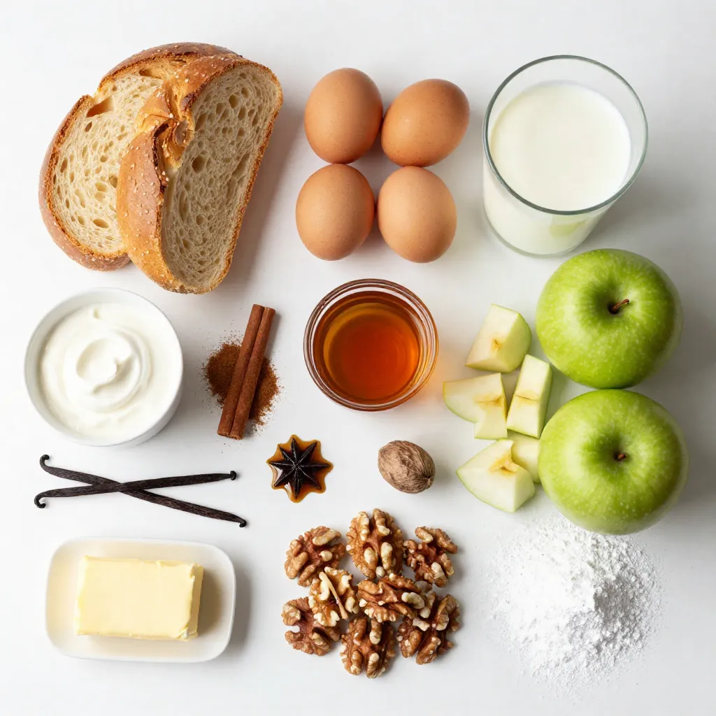 The main ingredients create a rich base for this dish. Thick bread gives it a soft texture. Eggs, milk, and heavy cream make a creamy custard. The apples add sweetness and a nice bite. Spices like cinnamon and nutmeg add warmth and comfort.