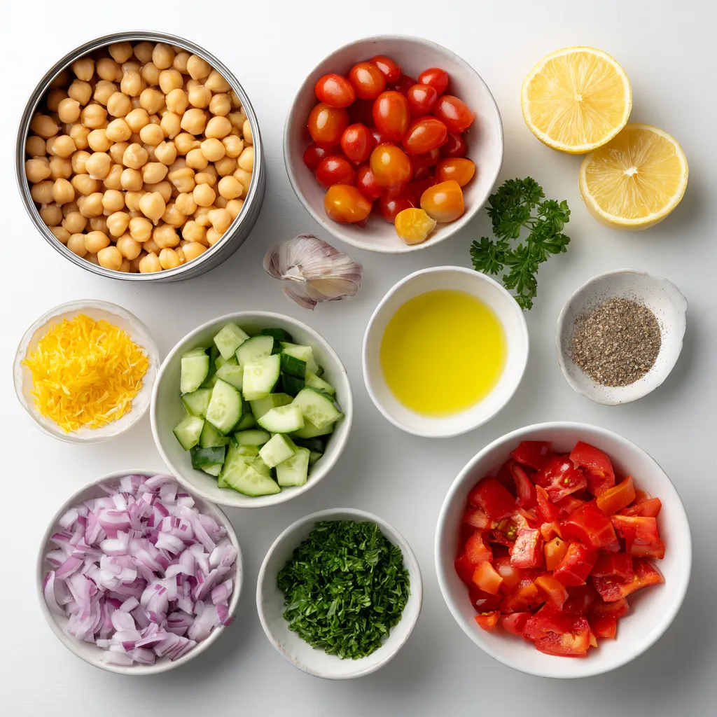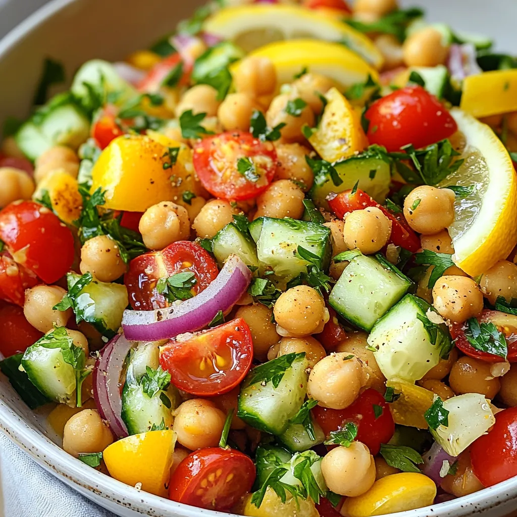 A refreshing salad with chickpeas, fresh vegetables, and a zesty lemon garlic dressing.
