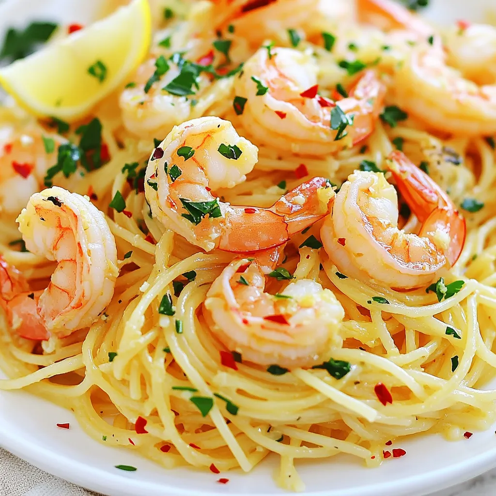 A delicious pasta dish featuring shrimp sautéed in garlic and lemon, tossed with spaghetti and fresh parsley.
