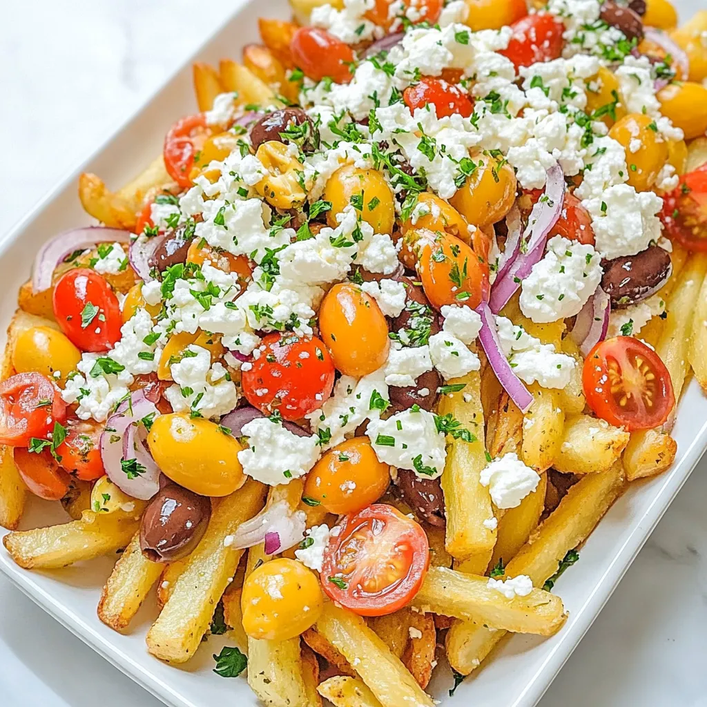 Crispy fries topped with feta cheese, Greek yogurt, and fresh vegetables for a delicious twist.