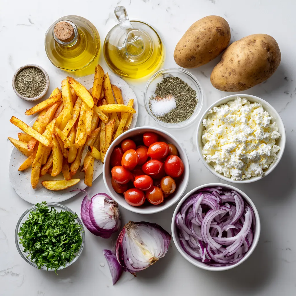 2. Layering the toppings after baking: Once the fries are crisp, take them out of the oven. Sprinkle 1 cup of crumbled feta cheese over the hot fries. Then, add 1/2 cup of halved cherry tomatoes, 1/4 cup of sliced Kalamata olives, and 1/4 cup of thinly sliced red onion on top.