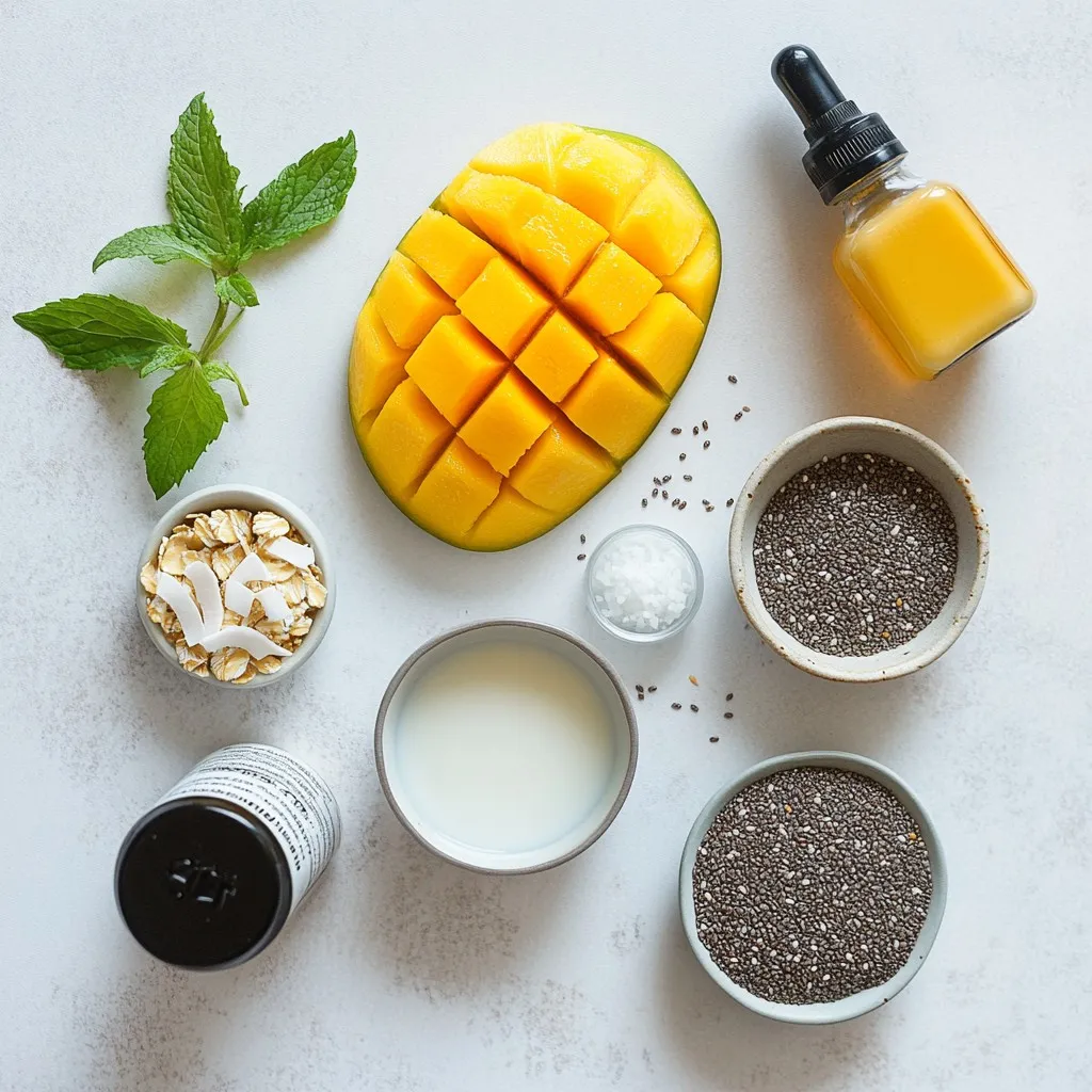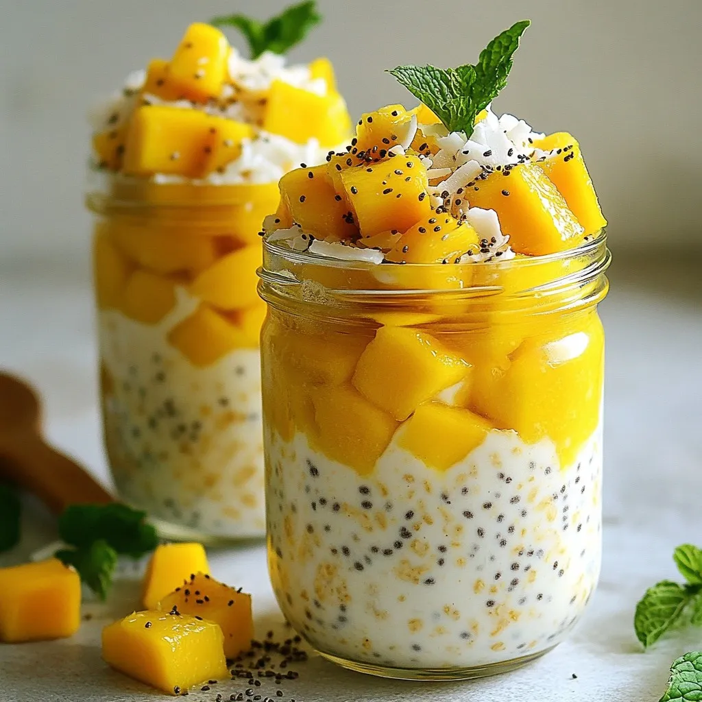 To make Mango Coconut Overnight Oats, you need the following ingredients: - 1 cup rolled oats - 1 cup coconut milk (canned or carton) - 1 ripe mango, diced - 1 tablespoon chia seeds - 2 tablespoons shredded coconut (unsweetened) - 1 tablespoon maple syrup (optional for sweetness) - 1/2 teaspoon vanilla extract - A pinch of salt - Fresh mint leaves for garnish (optional) You can customize your oats with extra toppings like nuts or seeds. Try adding berries or a drizzle of honey for a twist. Mango Coconut Overnight Oats offer a healthy start to your day. Each serving has around 300 calories. You get about 10 grams of protein, 12 grams of fat, and 45 grams of carbs. Key ingredients bring many health benefits: - Mango: Packed with vitamins A and C, mango boosts your immune system. It also has fiber, which helps digestion. - Coconut: This adds healthy fats. It can help keep your heart healthy and provide energy. - Oats: A great source of whole grains, oats can lower cholesterol. They also keep you full longer. These ingredients work together to make a tasty and healthy meal. Enjoy the flavors and the nutrition! {{ingredient_image_1}} To start, gather your ingredients. You need rolled oats, coconut milk, chia seeds, shredded coconut, and a ripe mango. In a mixing bowl, combine the rolled oats, coconut milk, chia seeds, shredded coconut, maple syrup, vanilla extract, and a pinch of salt. Stir well to mix everything evenly. This ensures all the flavors blend nicely together. Next, take your diced mango. Stir in half of the mango into the oat mixture. Set aside the other half for topping later. This adds a burst of fresh flavor! Now, it’s time to store your mixture. Divide the oats evenly into two jars or containers with lids. Seal the containers tightly. This helps keep flavors fresh. Place the jars in the refrigerator overnight or for at least four hours. This soaking time allows the oats to absorb all the delicious coconut milk. In the morning, pull the jars from the fridge. Give the oats a good stir. If you want a creamier texture, add a splash of coconut milk. Top each jar with the remaining diced mango and extra shredded coconut. For a fun touch, garnish with fresh mint leaves. This not only looks pretty but adds a refreshing flavor. Enjoy your tasty and healthy treat! For creaminess, you can adjust the coconut milk. If you want a richer taste, add more milk. If the oats feel too thick, add a splash more coconut milk in the morning. This gives a perfect creamy texture. If your oats turn out too runny, you might have added too much liquid. To fix this, add a bit more oats or chia seeds. They will soak up extra liquid and thicken the mix. To amp up the flavor, try adding spices like cinnamon or nutmeg. Just a pinch can make a big difference. Vanilla extract helps too, but you can explore almond or coconut extract for new tastes. If you like it sweeter, add more maple syrup. You can also use honey or agave syrup if you prefer. Taste the mix before you seal it up. This way, you can adjust to your liking. Pro Tips Choose Ripe Mangoes: For the best flavor, select mangoes that are slightly soft to the touch and have a sweet aroma. This ensures a juicy and flavorful addition to your oats. Customize the Sweetness: Adjust the maple syrup to your taste preference. If your mango is particularly sweet, you might not need any added sweetness at all! Experiment with Toppings: Feel free to add other toppings such as nuts, seeds, or additional fruits like berries or bananas for extra texture and flavor. Make it Vegan: This recipe is naturally vegan, but always check your coconut milk label to ensure it doesn’t contain any animal products if you’re strict about it. {{image_2}} You can make your mango coconut overnight oats even more fun! Try adding tropical fruits like pineapple or banana. These fruits add sweetness and a burst of flavor. You can also swap the coconut milk for almond milk or oat milk. This change gives a new taste while keeping it creamy. If you want a vegan option, this recipe is already perfect! All the ingredients are plant-based. If you need it gluten-free, make sure to use certified gluten-free oats. This way, you can enjoy your oats without worry. Mango coconut overnight oats stay fresh in the fridge for up to five days. Store them in sealed jars or containers. This keeps them tasty and safe. If you want to store them longer, freeze them. They can last for up to three months in the freezer. Make sure to use airtight containers. This prevents freezer burn and keeps flavors intact. You can serve mango coconut overnight oats cold or warm. If you prefer warm oats, heat them gently on the stove or in the microwave. Add a splash of coconut milk to keep them creamy. Stir well to mix in the heat. If you enjoy them cold, just grab a jar from the fridge and enjoy. The choice is yours! What can I substitute for coconut milk? You can use almond milk or oat milk. These options work well. They give a nice flavor too. If you want a thicker texture, try using Greek yogurt instead. Each choice changes the taste slightly but keeps it yummy. Can I use quick oats instead of rolled oats? Yes, you can. Quick oats will cook faster and get softer. They may change the texture a bit. If you like a creamy consistency, quick oats are a good option. However, rolled oats give more chewiness, which some people prefer. How do I make this recipe in larger batches? To make more servings, just double or triple the recipe. Use a larger bowl for mixing. Keep the same ratios for the ingredients. This method makes it easy to feed more people. Just remember to store them in separate jars. How long do overnight oats need to soak? Overnight oats need at least 4 hours to soak. Soaking them overnight gives the best results. This time lets the oats absorb the coconut milk. It also softens them for a creamy texture. Can I add protein powder to the recipe? Yes, you can add protein powder. Just mix it in with the other ingredi