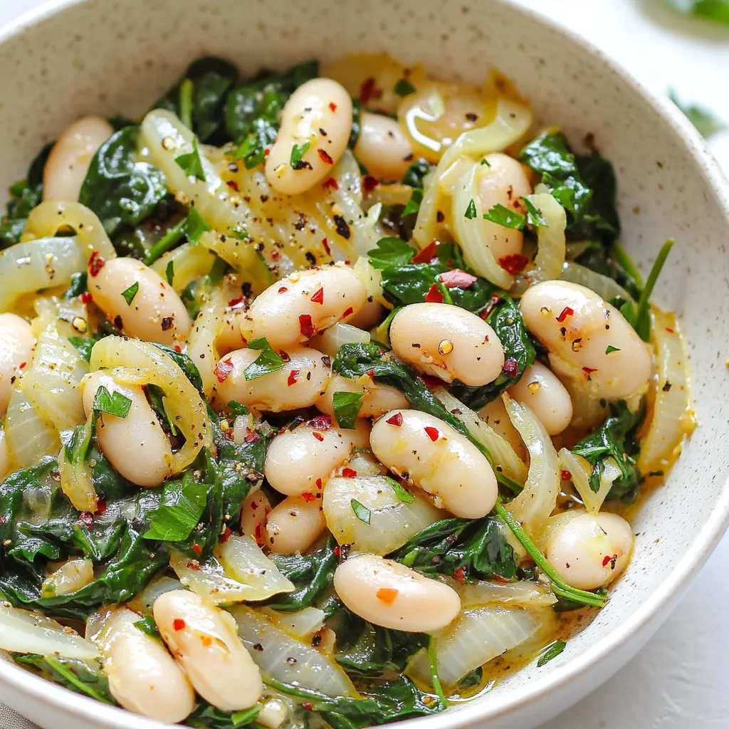 A delightful and healthy skillet dish featuring white beans and fresh spinach, perfect for a quick meal.