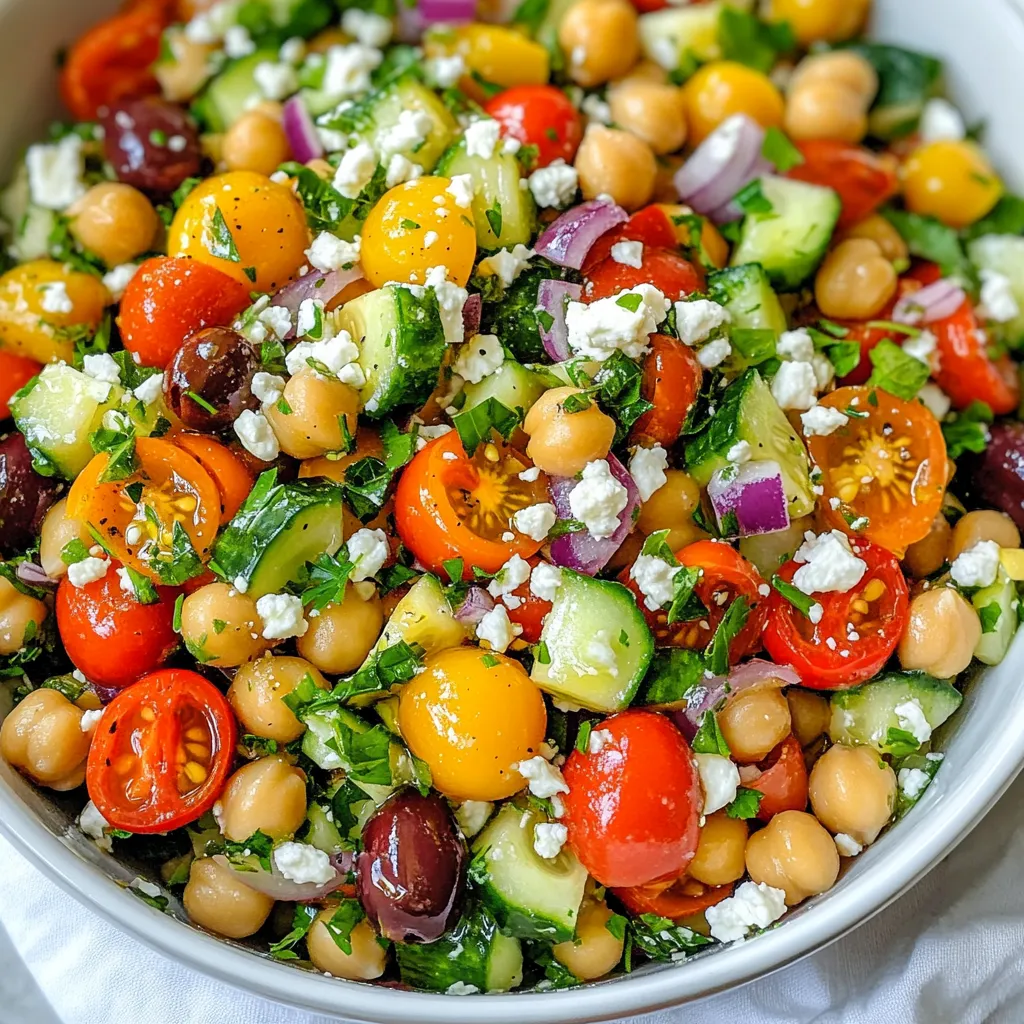 A refreshing and vibrant salad featuring chickpeas, fresh vegetables, and a tangy dressing.