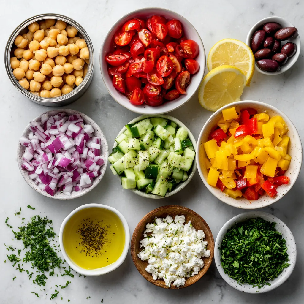 You can swap out some ingredients if needed. Use canned white beans instead of chickpeas for a different taste. Any tomato can work, but grape tomatoes are great too. If you don’t have cucumbers, try zucchini. For the bell pepper, any color works, or you can skip it. If you want a milder flavor, use green onion instead of red onion. For a vegan option, omit the feta. You can use avocado for creaminess instead.