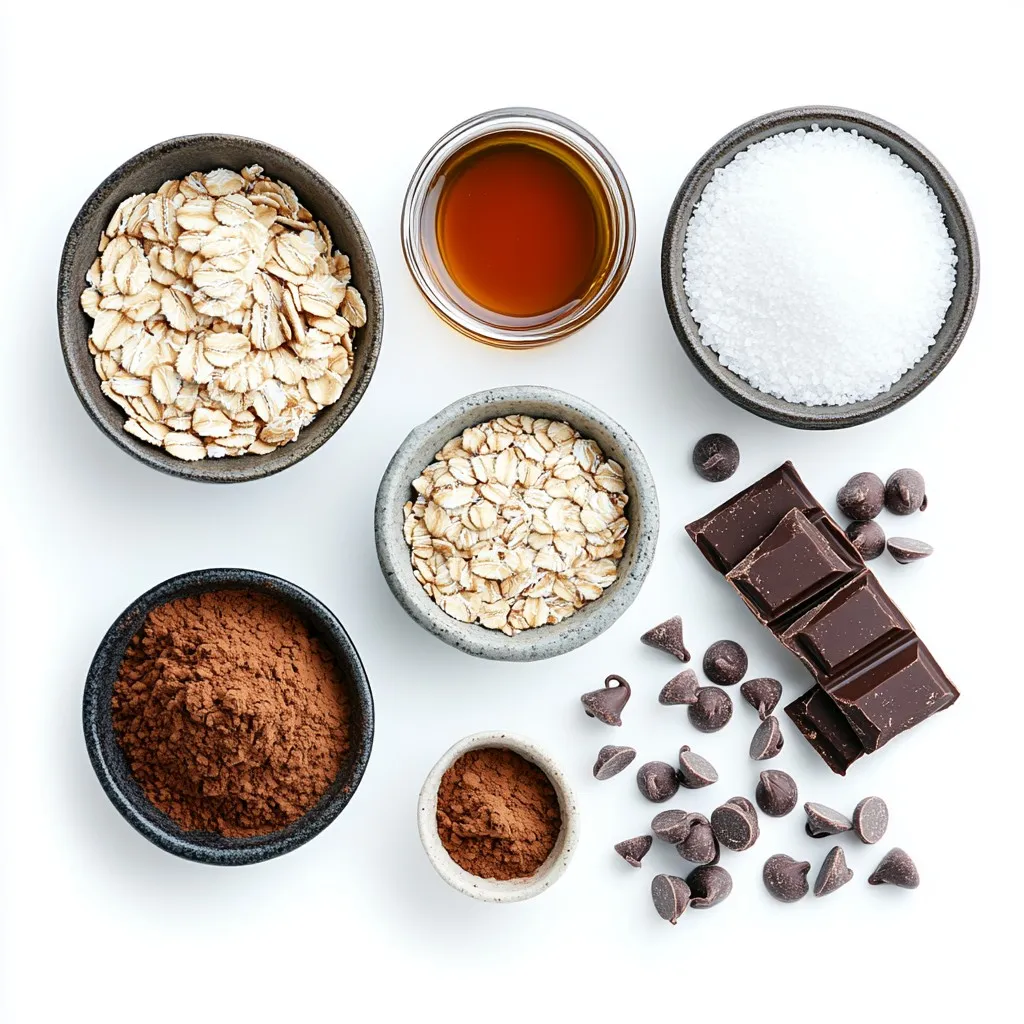 To make No-Bake Chocolate Mint Bars, gather these ingredients. You will need rolled oats, almond flour, and maple syrup. Peanut butter adds creaminess, while cocoa powder gives rich chocolate flavor. A pinch of salt enhances all tastes, and peppermint extract adds that fresh mint kick.