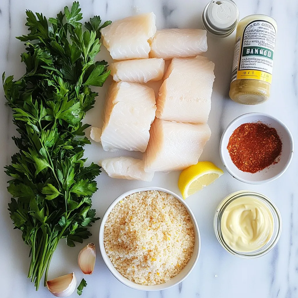 - 4 cod fillets (about 6 oz each) - 1 cup panko breadcrumbs - 1/2 cup grated Parmesan cheese The cod fillets are the star of this dish. They are mild and flaky, perfect for the crunchy topping. Panko breadcrumbs give a light and crispy texture. Use fresh grated Parmesan for the best flavor. - 1/4 cup fresh parsley, chopped - 2 garlic cloves, minced - 1 teaspoon lemon zest Fresh parsley adds color and a bright taste. Minced garlic gives a warm, savory flavor. Lemon zest brightens the dish with its fresh aroma. - 1/2 teaspoon smoked paprika - 1/4 cup mayonnaise - 2 tablespoons Dijon mustard - 1 tablespoon olive oil - Salt and pepper to taste Smoked paprika adds a subtle smokiness. Mayonnaise and Dijon mustard create a creamy base for the topping. Olive oil brings richness and helps the crust brown. Season with salt and pepper to enhance all the flavors. Each ingredient plays a key role in making this dish flavorful and easy to prepare. This recipe is simple yet impressive, perfect for a cozy dinner. {{ingredient_image_1}} 1. Preheat your oven to 425°F (220°C). This high heat gives a great crust. 2. Line a baking sheet with parchment paper for easy cleanup. 3. In a bowl, mix these ingredients for the breadcrumb topping: - 1 cup panko breadcrumbs - 1/2 cup grated Parmesan cheese - 1/4 cup fresh parsley, chopped - 2 minced garlic cloves - 1 teaspoon lemon zest - 1/2 teaspoon smoked paprika - Salt and pepper to taste 1. Pat the cod fillets dry using a paper towel. This step helps the coating stick. 2. Season both sides with a sprinkle of salt and pepper. This enhances the flavor. 3. In a separate bowl, mix: - 1/4 cup mayonnaise - 2 tablespoons Dijon mustard Stir until they blend well. This mixture keeps the cod moist. 1. Spread a thin layer of the mayonnaise mixture on each fillet. This helps the crumbs stick. 2. Press the breadcrumb mixture onto the mayonnaise side of the fillets. Make sure they are well covered. 3. Drizzle a little olive oil on top of the crust for added richness and flavor. 4. Place the cod on the lined baking sheet. Bake for about 12-15 minutes. Check for doneness by ensuring the fish is opaque and flakes easily with a fork. To get the best crust, use panko breadcrumbs. They are light and crispy. Mix them with grated Parmesan cheese, fresh parsley, minced garlic, lemon zest, and smoked paprika. This mix gives a great flavor and crunch. Tips for breadcrumb consistency: - Use fresh panko for the best texture. - Avoid over-mixing; keep it light and fluffy. How to avoid sogginess: - Pat the cod dry before adding the mayonnaise. - Don’t skip the olive oil drizzle; it helps the crust stay crisp. You can bake or broil your cod. Baking is easier and gives even heat. Broiling cooks faster but needs close watch. Suggestions for baking vs. broiling: - Bake at 425°F for a golden crust and juicy fish. - Broil for 5-7 minutes for a faster cook, but stay nearby. Monitoring fish for perfect doneness: - Cook until the fish flakes easily with a fork. - The internal temperature should reach 145°F. Pair your Parmesan crusted cod with bright, fresh sides. This adds color and balance to the meal. Ideal side dishes: - Serve on a bed of sautéed spinach. - Add roasted vegetables for more flavor. Garnishes for enhanced presentation: - Use lemon wedges for a pop of color. - Drizzle olive oil over the plate for a nice finish. Pro Tips Fresh Ingredients: Use fresh cod fillets for the best flavor and texture. Frozen cod can also be used, but ensure it is fully thawed and pat it dry before seasoning. Customize the Crust: Feel free to add other herbs or spices to the breadcrumb mixture, such as thyme or cayenne pepper, to suit your taste preferences. Check for Doneness: To ensure your cod is perfectly cooked, use a fork to check if it flakes easily. The internal temperature should reach 145°F (63°C). Let it Rest: Allow the cod to rest for a few minutes after baking. This helps the juices redistribute, resulting in a more flavorful and moist fish. {{image_2}} Using different types of breadcrumbs can change the taste and texture of your dish. Traditional panko gives a light and crispy crust. If you want a gluten-free option, use gluten-free breadcrumbs. They work well and still provide a nice crunch. You can also try crushed cornflakes or even ground nuts for a unique twist. Each option adds its own flavor and texture to the cod. You can boost the flavor of your Parmesan crusted cod by adding herbs and spices. Fresh herbs like thyme or dill can add a bright taste. Just chop them finely and mix them into your breadcrumb mixture. Spices can also make your dish pop. A pinch of cayenne pepper adds heat and depth. Experiment with these additions to find your perfect blend of flavors. While cod is delicious, you can use other fish too. Tilapia and haddock are great substitutes. They both have mild flavors that pair well with the Parmesan crust. Just make sure to adjust the cooking time based on the thickness of the fish. This way, you can enjoy a variety of tastes while keeping the same crispy crust! Store leftover Parmesan crusted cod in an airtight container. This keeps it fresh. It lasts for about 2-3 days in the fridge. Label your container with the date. This helps you track how long it has been stored. To reheat, use the oven for best results. Preheat your oven to 350°F (175°C). Place the cod on a baking sheet. Cover it loosely with foil to keep it moist. Heat for about 10-15 minutes or until warmed through. Avoid using the microwave, as it can dry out the fish. You can freeze cooked cod for later use. Wrap each piece tightly in plastic wrap. Then place the wrapped cod in a freezer bag. Squeeze out as much air as you can. It keeps well for up to 2 months. When ready to eat, thaw it in the fridge overnight before reheating. The best side dishes for Parmesan crusted cod include: - Sautéed spinach: The greens add brightness. - Roasted vegetables: Carrots or zucchini work well. - Rice pilaf: It com