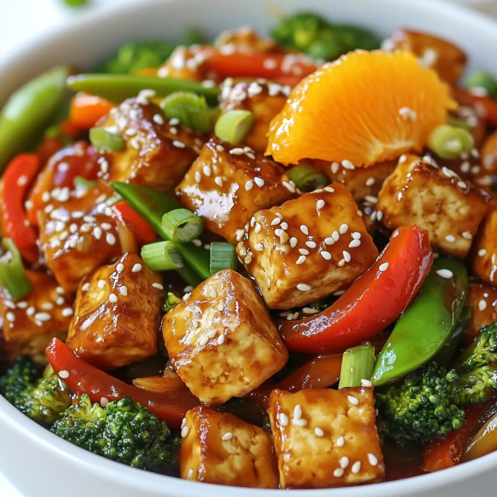 A vibrant and flavorful stir fry featuring tofu, fresh vegetables, and a zesty orange sauce.