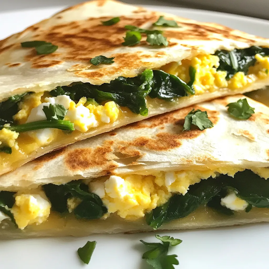 - 4 flour tortillas (8-inch size) - 2 cups fresh spinach, chopped - 1 cup feta cheese, crumbled - 1 cup shredded mozzarella cheese - 4 large eggs - 1 tablespoon olive oil - 1/4 teaspoon red pepper flakes - Fresh herbs (like parsley or cilantro) - Salt and pepper For a tasty Spinach Feta Breakfast Quesadilla, gather these main ingredients. You need flour tortillas, fresh spinach, feta cheese, mozzarella cheese, and eggs. Each ingredient adds flavor and texture to your meal. You can also add optional ingredients for extra flavor. Olive oil helps cook the spinach. Red pepper flakes give a spicy kick. Fresh herbs add a burst of freshness. Use salt and pepper to enhance flavors. When you have all your ingredients ready, you can make this dish in no time. It’s simple, quick, and perfect for breakfast or a snack. {{ingredient_image_1}} - Sautéing the spinach: Start by heating olive oil in a large skillet over medium heat. Once hot, add chopped spinach. Sauté it for 2-3 minutes until it wilts. This step brings out the flavor and makes the spinach tender. - Whisking the eggs: In a separate bowl, crack the eggs and add salt and pepper. If you want some heat, add red pepper flakes. Whisk until everything is mixed well. This mixture will create a creamy filling in your quesadilla. - Cooking the egg mixture: Pour the egg mixture into the skillet with the wilted spinach. Stir gently as it cooks. This should take about 3-4 minutes. Cook until the eggs are just set but still soft. Remove from heat to avoid overcooking. - Assembling the quesadillas: Take a tortilla and lay it flat. On one half, sprinkle shredded mozzarella cheese. Next, spoon a portion of the spinach and egg mix on top. Finish by adding crumbled feta cheese for rich flavor. - Folding and cooking: Fold the tortilla in half to make a semi-circle. Clean the skillet and place it back on low heat. Cook the quesadilla for about 3-4 minutes on each side. You want it golden brown and the cheese melted. - Slicing and garnishing: Once cooked, remove the quesadilla from the skillet. Use a sharp knife to slice it into wedges. This makes it easier to serve and eat. - Presentation tips: Serve your quesadillas on a colorful plate. Add avocado slices or a small bowl of salsa for dipping. This adds color and flavor to your meal, making it even more appealing. To make the best quesadilla, focus on even cooking. Heat the skillet on low. This helps the cheese melt well without burning the tortillas. Flip them gently. Check for a golden-brown color. This means they are ready to eat. Adjusting seasoning is key to great flavor. Start with a pinch of salt and pepper. Taste as you go. If you like spice, add red pepper flakes. This will give your quesadilla a nice kick. You can make your quesadilla unique by adding more vegetables. Try bell peppers, mushrooms, or onions. These add flavor and color to your dish. Cheese variations can also change your quesadilla. While feta and mozzarella are tasty, you might enjoy cheddar or pepper jack as well. These options can add a different twist to your meal. Pro Tips Use Fresh Spinach: Fresh spinach not only adds vibrant color but also enhances the flavor and nutrition of your quesadilla. Opt for organic spinach if possible for the best results. Customize Your Cheese: While feta and mozzarella are delicious, you can experiment with other cheeses like goat cheese or pepper jack for a different flavor profile. Perfectly Cooked Eggs: To ensure your eggs are fluffy and not overcooked, keep the heat low and stir gently. Remove them from the heat while they’re still slightly runny, as they will continue to cook off the heat. Serving Suggestions: Pair these quesadillas with a side of guacamole or a fresh salad to balance the richness of the cheese and add more nutrients to your meal. {{image_2}} You can add mushrooms or bell peppers for more flavor. Sauté sliced mushrooms with spinach for a rich taste. Bell peppers add crunch and color. Use any color you like: red, yellow, or green. This adds good nutrients and makes your quesadilla even better. If you want more protein, try adding cooked chicken or bacon. Cooked chicken adds a nice texture. Just chop it and mix it in. Bacon gives a smoky flavor. Cook it crispy, then crumble it over the eggs. Both options make your breakfast even more filling. For a spicy kick, add jalapeños or hot sauce. Slice fresh jalapeños and mix them in with the eggs. You could also drizzle hot sauce on top. This gives your quesadilla a nice heat. Adjust the spice level to suit your taste. You can store leftover quesadillas in the fridge. Place them in an airtight container. They stay fresh for about 3 days. Before covering, let them cool to room temperature. This helps prevent sogginess. When you are ready to eat, check for any signs of spoilage. Freezing quesadillas is easy and great for quick meals. Stack the quesadillas with parchment paper between each one. This keeps them from sticking together. Then, place them in a freezer bag or container. They can last for up to 2 months in the freezer. When you're ready, thaw them in the fridge overnight before reheating. To reheat, use a skillet for the best results. Heat the skillet over low to medium heat. Cook each quesadilla for about 4 minutes on each side. This keeps the tortilla crispy. You can also use an oven. Preheat the oven to 350°F and bake for about 10 minutes. Enjoy your quesadilla warm and melty! Yes, you can make these quesadillas ahead of time. To store them, let the quesadillas cool first. Then, wrap them in plastic wrap or aluminum foil. Keep them in the fridge for up to 2 days. You can also freeze them for up to a month. Just be sure to separate layers with parchment paper to prevent sticking. You can serve many tasty sides with your quesadilla. Here are some ideas: - Fresh avocado slices - Salsa for dipping - A light salad with lemon dressing - Sliced tomatoes with a sprinkle of salt - Greek yogurt for a creamy touch Making a glute
