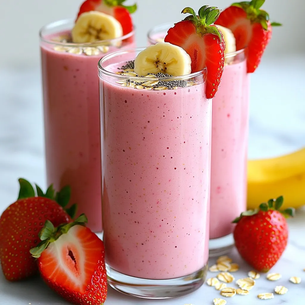 A delicious and nutritious smoothie made with fresh strawberries, banana, and oats, perfect for a quick breakfast or snack.