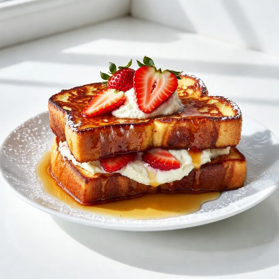 A delicious and indulgent breakfast treat featuring thick-cut brioche or challah bread stuffed with a creamy strawberry cheesecake filling.