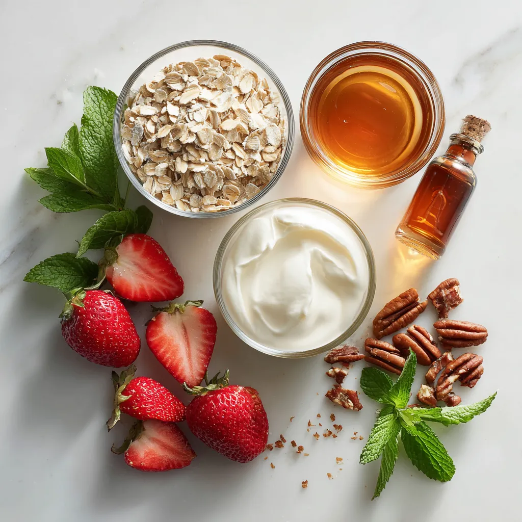 These ingredients blend together to create a creamy and fruity breakfast. The rolled oats form the base, while the yogurt adds creaminess and protein. The maple syrup gives a touch of sweetness. The almond extract brings out the flavors. Fresh strawberries provide a juicy burst. Nuts add a nice crunch, making each bite delicious.