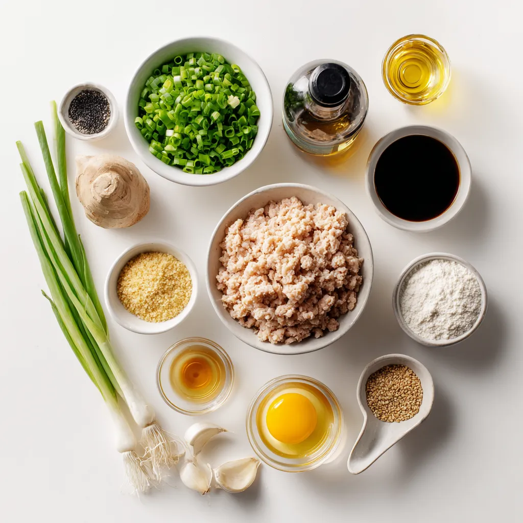 • In a large bowl, combine the ground chicken, breadcrumbs, green onions, egg, minced garlic, grated ginger, soy sauce, and a pinch of salt and pepper. Mix until just combined.