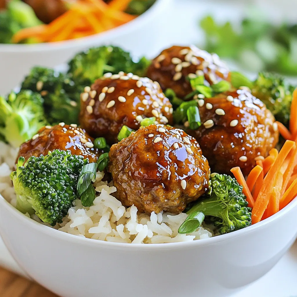 Serve in colorful bowls for a fun look. Arrange the cooked rice as a base. Next, add your teriyaki meatballs on top. Layer steamed broccoli and shredded carrots around them. For a pop of color, use a rainbow pattern. Garnish with sesame seeds and sliced green onions. Add a lime wedge for a fresh touch. Serve with chopsticks to create an authentic dining experience.