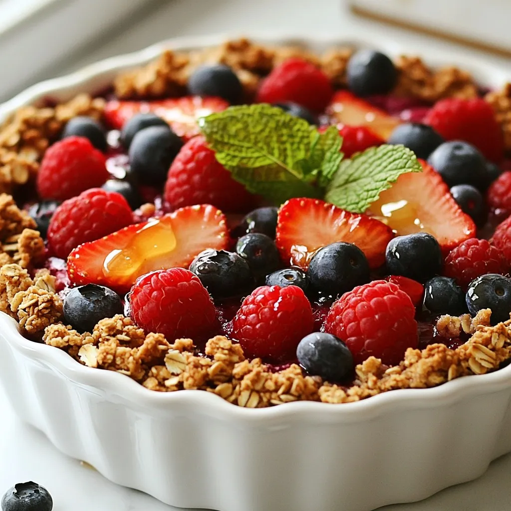 A delicious dessert made with fresh strawberries, blueberries, and raspberries, topped with a crunchy oat mixture.