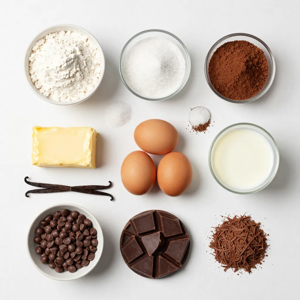 To create the best Triple Chocolate Fudge Cake, gather your ingredients first. This cake needs three types of chocolate to reach its full delight. I use semi-sweet chocolate chips, dark chocolate chunks, and milk chocolate shavings for the top.